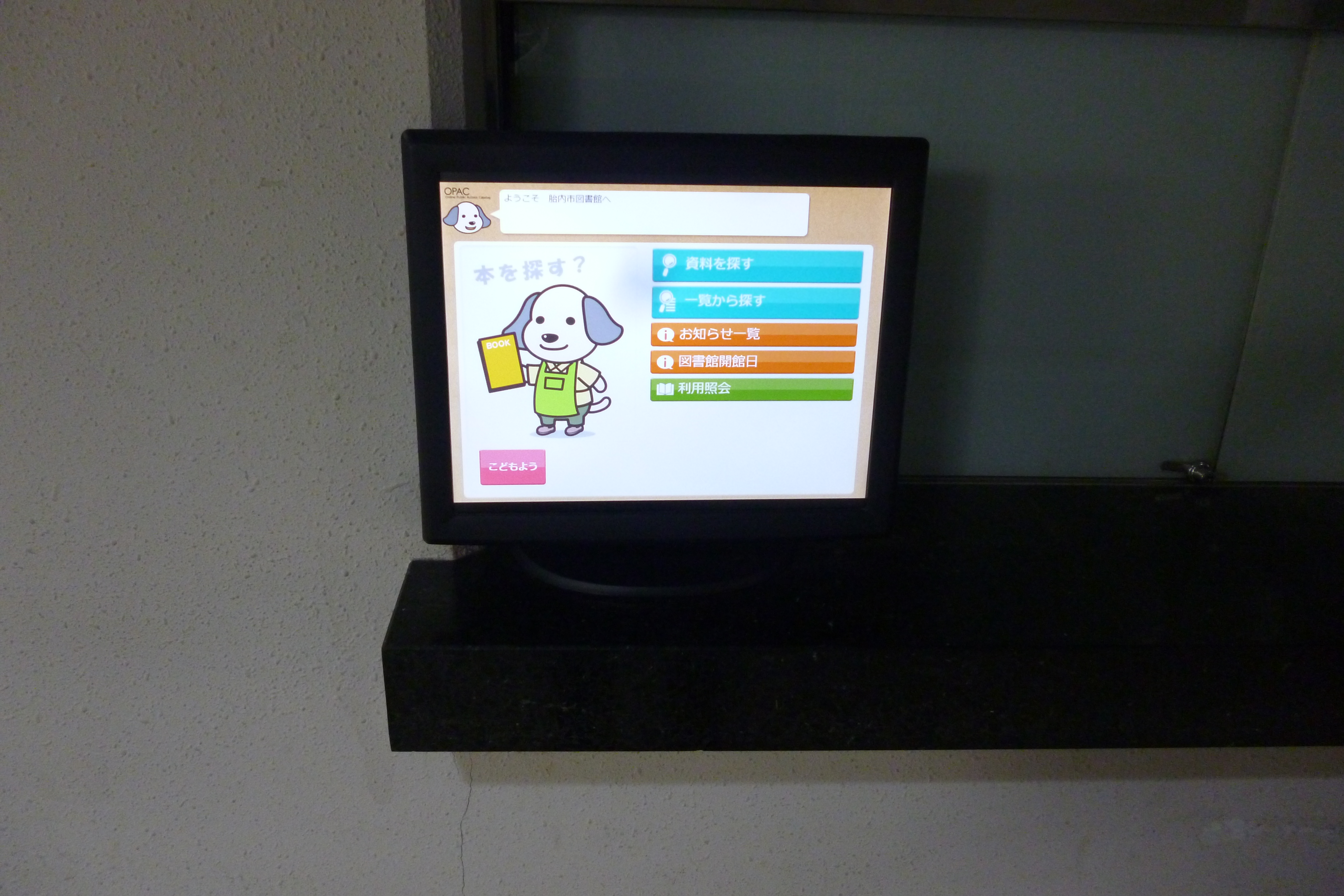 図書館検索用端末では、資料 検索、蔵書の確認、資料予約 などができます。設置場所は 1階カウンター脇に2台、2階カウンター脇に1台あります。